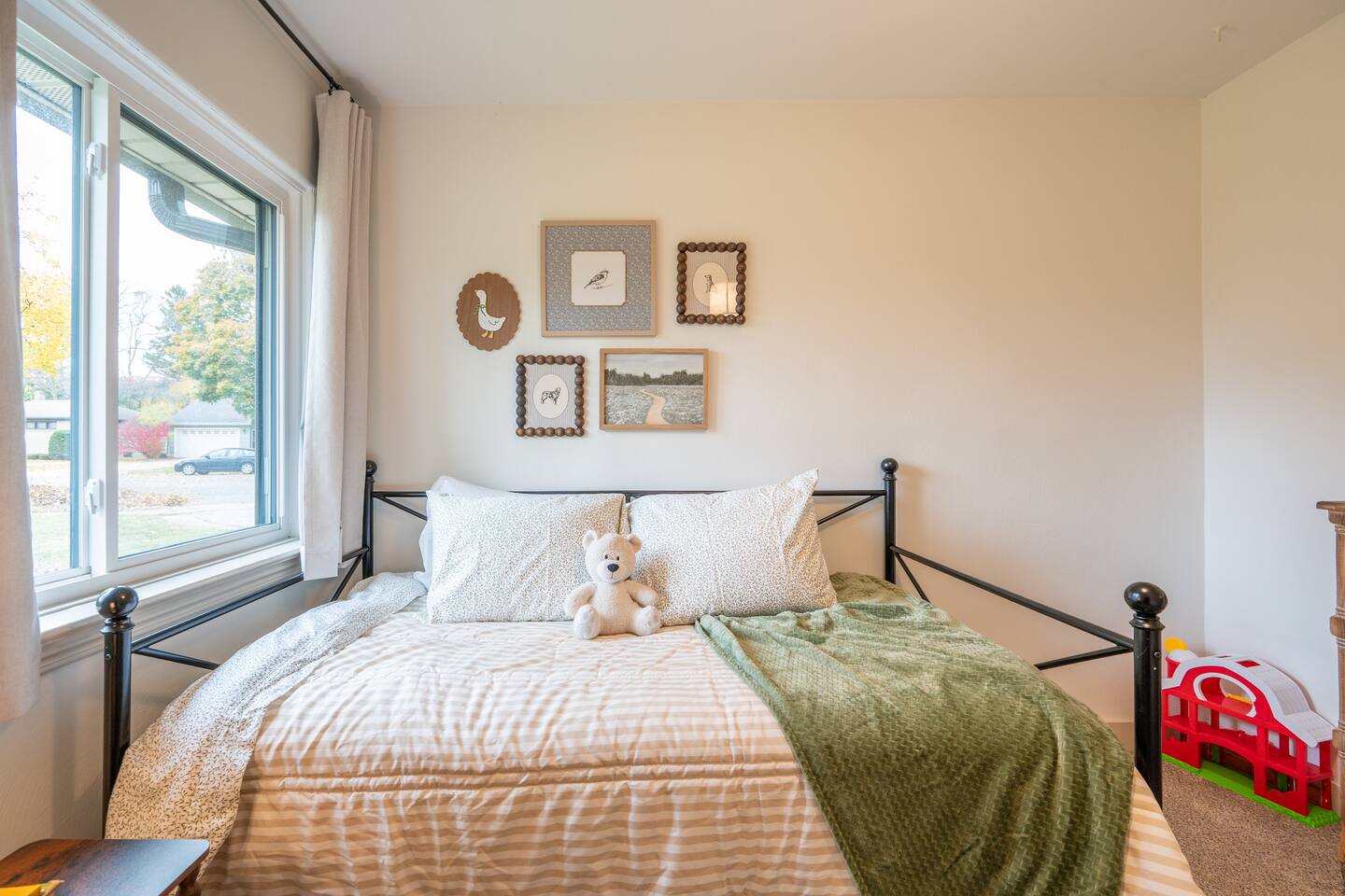 This bright and comfortable 3-bedroom home is designed to give families, groups, and business travelers a place to relax and feel at home. Quick highlights: ✓ 3 bedrooms with comfortable sleeping options ✓ Fully equipped kitchen ✓ Cozy living room with smart TV and Wi-Fi ✓ Private patio with seating, grill, and fire pit ✓ On-site laundry ✓ Driveway parking for two vehicles The house includes a spacious layout with a fully equipped kitchen for preparing meals, a cozy living room with smart TV and high-speed Wi-Fi, and central heating and air conditioning to keep the home comfortable year-round. On-site laundry makes extended stays simple and convenient. Sleeping arrangements include a primary bedroom with a king bed, a second bedroom with a queen bed and computer desk/workspace, and a third bedroom with two twin beds that are ideal for children or additional guests. Clean linens, towels, and basic toiletries are provided for your stay. Guests will love spending time outdoors on the private patio, complete with comfortable seating, a grill for easy cookouts, and a fire pit for cozy evenings. Off-street parking is available for your convenience. Please note that while pets are not permitted at Braley House, service animals are welcome. Braley House is centrally located in Midland, just minutes from downtown shopping and dining, Dow Gardens, the Midland Center for the Arts, local parks, and event venues. Whether you’re here for a family visit, a weekend getaway, or a longer stay, you’ll find everything you need for a stress-free and enjoyable experience. Approximate drive times from Braley House: ✓ Midland Country Club (LPGA Event): 4 minutes ✓ Dow Diamond: 5 minutes ✓ Dow Gardens: 5 minutes ✓ Midland Center for The Arts: 5 minutes ✓ Downtown Midland: 5 minutes ✓ Midland County Fairgrounds: 10 minutes ✓ Midland Civic Arena: 11 minutes